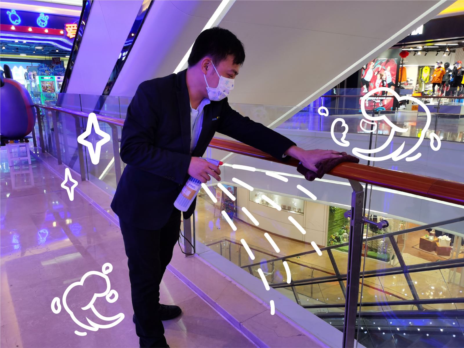 商场主出入口、室外电子屏、卫生间、扶梯、电梯间、停车场、垃圾房、商户门口等重点区域,尤其是密闭空间更是有专人负责进行高频次消毒杀菌,你可以在公共区域的明显位置以及每个商户门前,看到时时更新的消毒记录。
